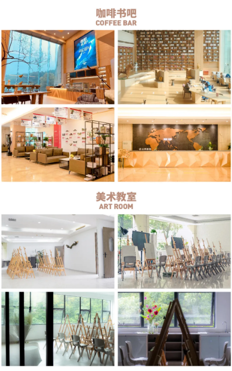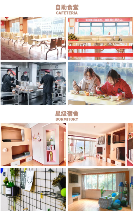 學(xué)校建立高標(biāo)準(zhǔn)自助食堂、五星級(jí)宿舍、美術(shù)館、多媒體教室、體育館、舞蹈室、閱覽室、